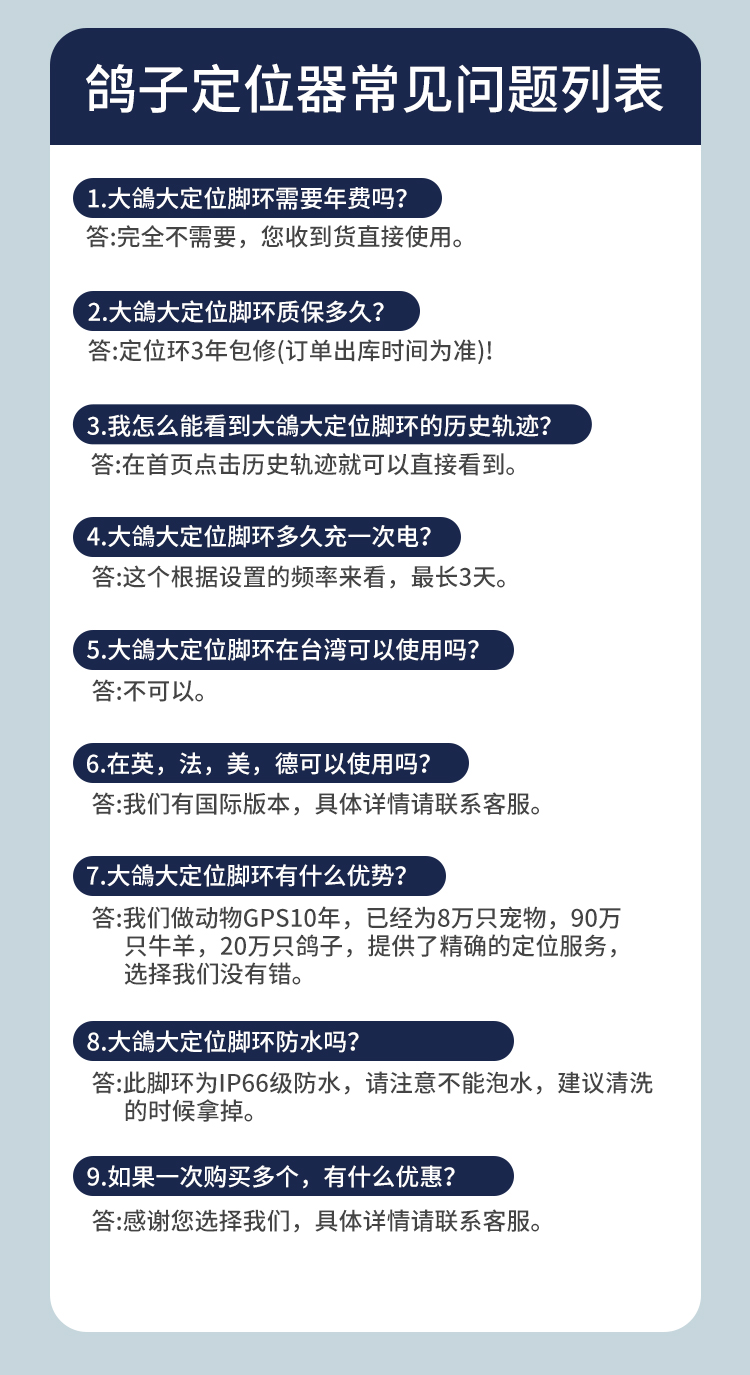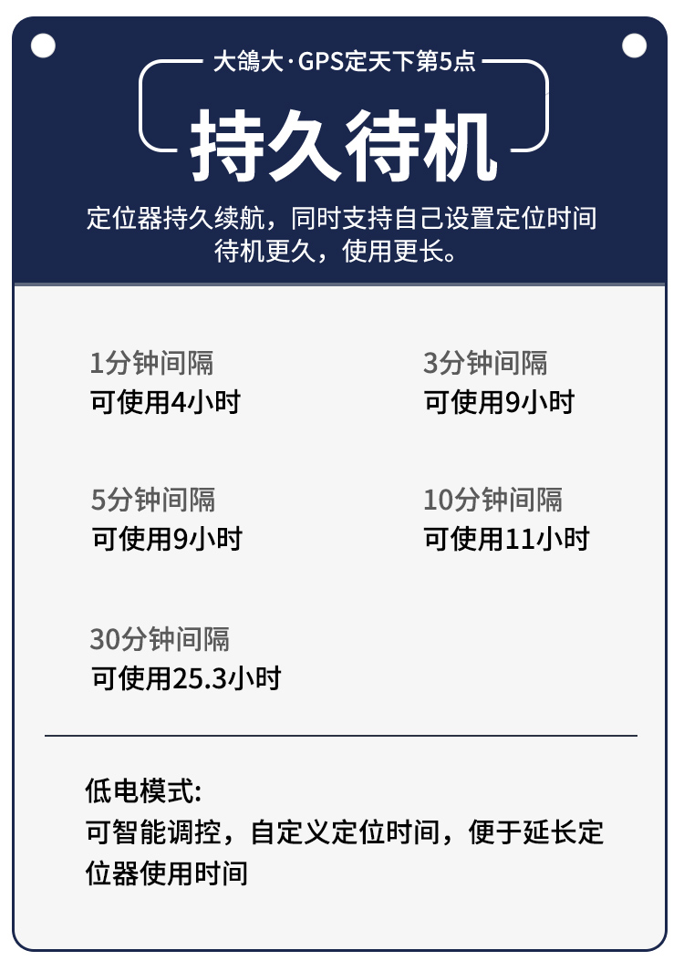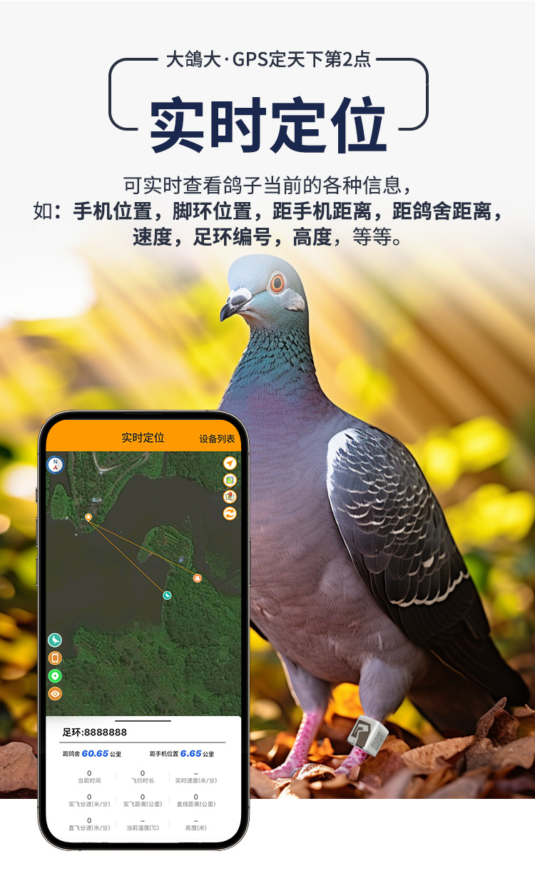 这是一款专门为飞行动物设计的防丢失追踪定位器。作为吉祥乐、数字鸽等知名品牌的同款定位器,大鸽大GPS定位脚环在品质上同样值得信赖。它采用了GPS和BD(北斗)定位技术,可以实时定位、查看轨迹,轻量便携、佩戴舒适,并能长时间待机。无论是公棚、协会、俱乐部中用于训飞与比赛的赛鸽,还是家庭里深受宠爱的鹦鹉、八哥、渡鸦等宠物鸟,大鸽大GPS定位脚环都能完美适配,是爱鸟安全出行的必备保障。