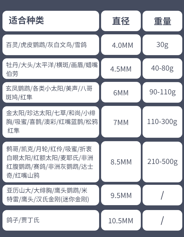 适用对象:鸽子、鹦鹉、八哥、渡鸦、红隼等小型鸟类。